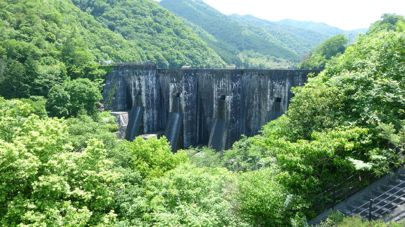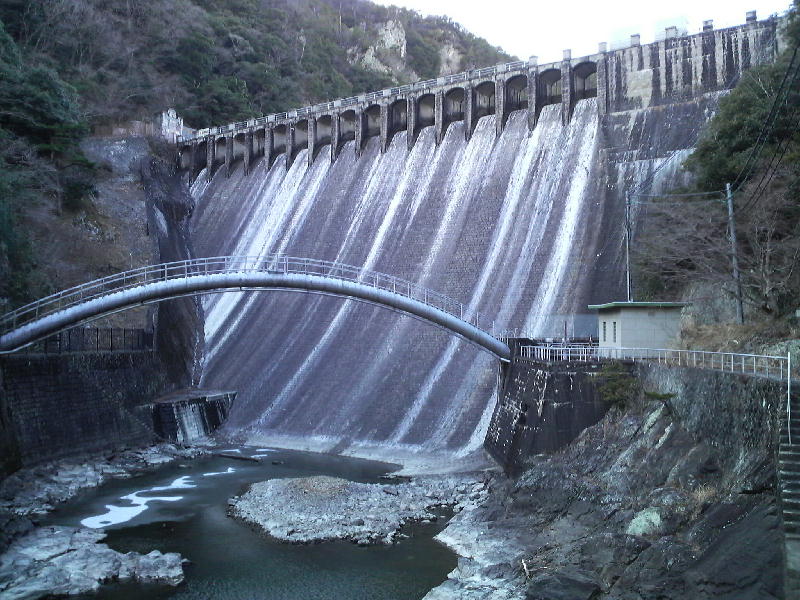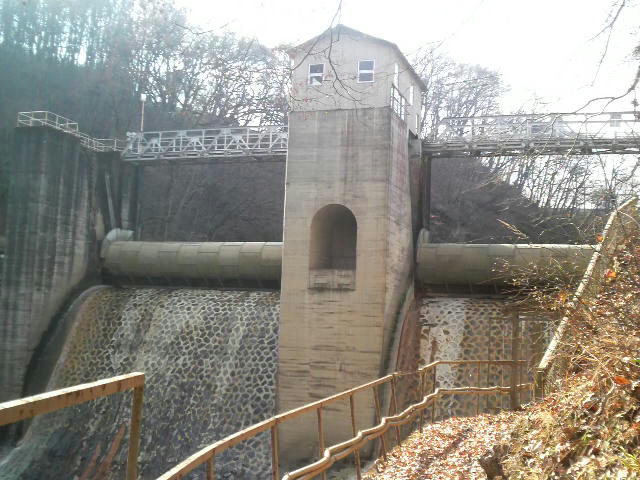 堤体が石張りでローリングゲートの動きも興味深いというか、想像し難い。何より正面からの姿がなんか、可愛らしくて癒される。柵があって入れないものの、近くに駅や学校があるので、その姿と相まって親近感を感じる。訪れたときに、堤体の下の石張りから水がちょっと漏れてて、歴史を感じさせた。 | 歴史・大津ダム |
