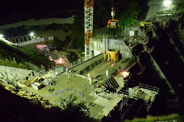| <選評・森 日出夫> まさしくダム工事の最盛期を切り取った一枚です。夜間、大型クローラクレーンでコンクリートを打設している様子が生き生きと写し取られています。周辺の暗闇の中で、打設現場だけが煌々と照らされ、バケットから放出されるコンクリートを男たちが待ち構える様は、見る者に現場の緊張感を伝えます。 |