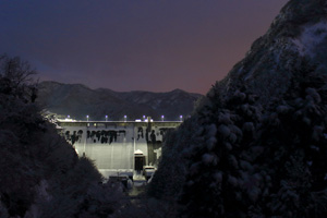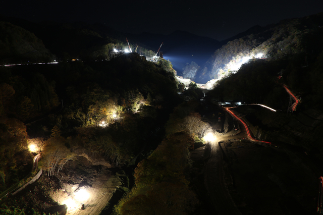 | <選評・森 日出夫> 深まる秋の深夜、工事現場だけがボワッと浮かび上がる幻想的な写真です。大型ダム工事である八ッ場ダムでは、堤体基礎掘削、仮設備設置工事を昼夜通して実施しています。この暗闇の中で、おそらく100人以上の人が広範囲に分かれて働いているのでしょう。夜間作業のこの写真から、ダム現場の広さが改めて実感できました。 |