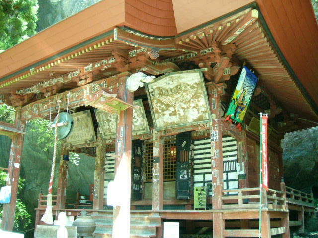 秩父第二十八番 橋立堂(はしだてどう) 背景に高さ65mの断崖を控え、小さな丹塗りの堂です。江戸中期の建築とされ、扇のような垂木の直線が美しい建築物です。厨子の奥に、ほのかに見える本尊は、秩父札所の中でも唯一の「馬頭観音」を本尊としています。かつて唯一の交通手段だった馬を大切にする人々の心が偲ばれます。 |